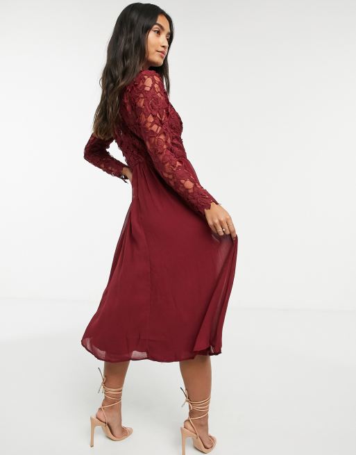 Chi Chi London lace long sleeve midi dress in burgundy Very well made.