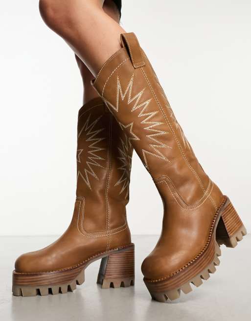ASOS DESIGN Cosmic leather cleated western knee boots in tan Very well made.