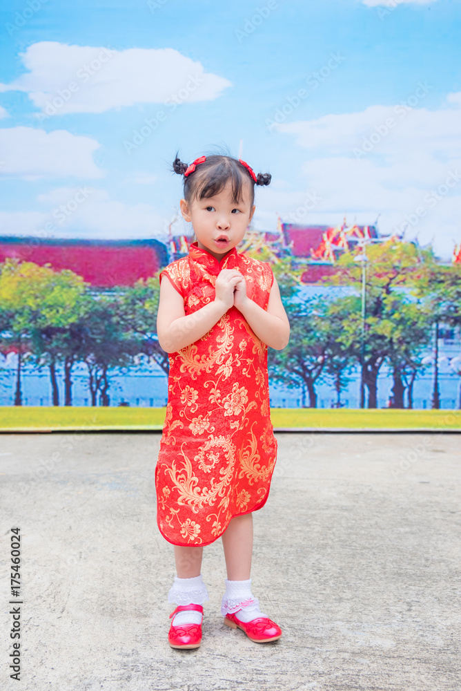 Little chinese girl in traditional chinese costume with funny face Very well made.