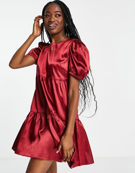 Glamorous puff sleeve smock dress in burgundy satin ASOS Very well made.