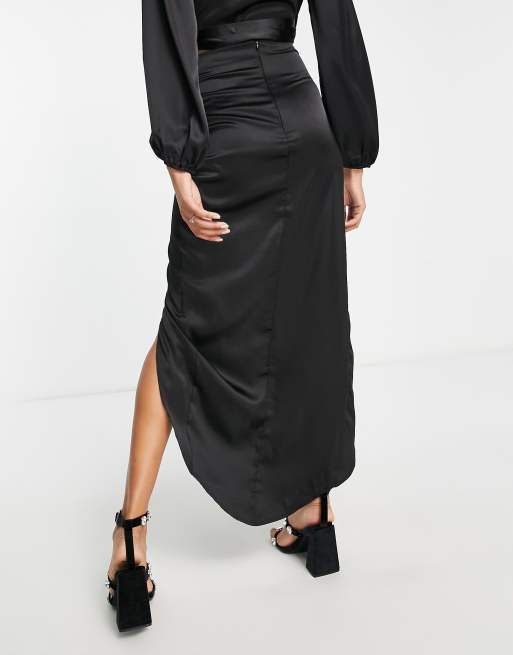 Flounce London satin high waist maxi skirt with leg split in black Very well made.