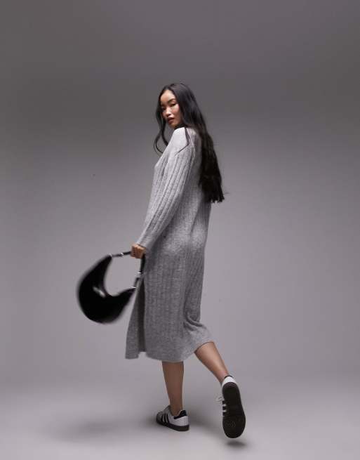 Topshop knitted oversized ribbed v neck midi sweater dress in gray Very well made.