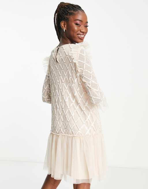 Little Mistress embellished diamond tulle mini dress in cream Very well made.