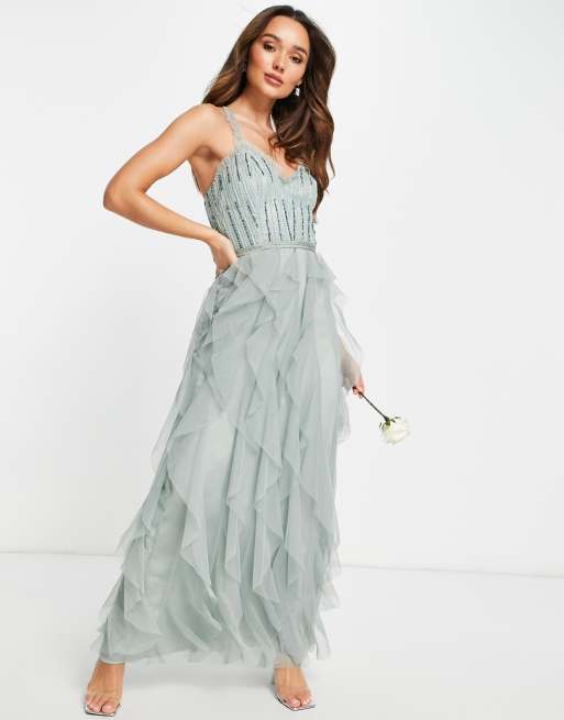 Little Mistress Bridesmaid embellished ruffle mesh maxi dress in blue Very well made.