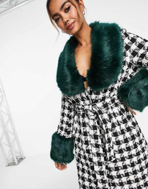 Miss Selfridge boucle faux fur collar and cuff wrap coat in mono check Very well made.