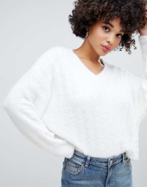 Missguided fluffy ribbed v neck jumper in white Very well made.