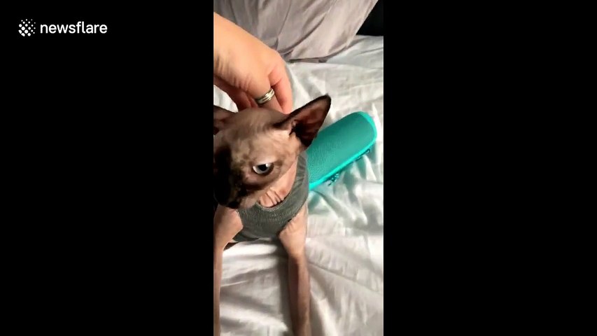 Dobby is free Hilarious moment hairless cat befuddled by DYI sock hoodie Very well made.