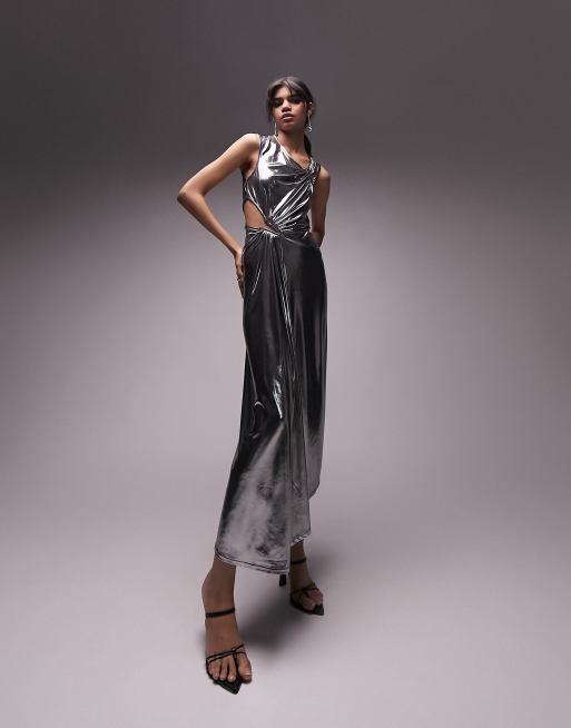 Topshop asymmetric metallic cut out midi dress in silver Very well made.