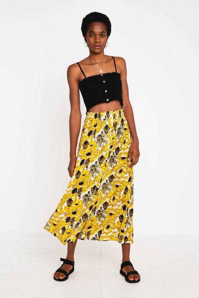 UO Yellow Floral Button Front Midi Skirt Urban Outfitters Very well made.