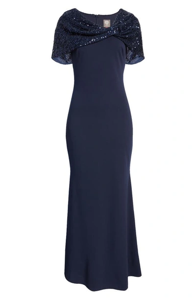 Crepe Trumpet Gown With Attached Sequin Shawl In Navy Very well made.