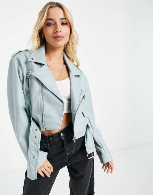 Topshop faux leather cropped biker jacket in blue Very well made.