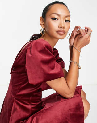 ASOS DESIGN puff sleeve velvet mini dress with godet detail in burgundy Very well made.