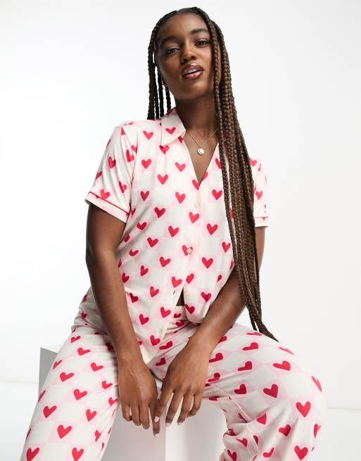 Chelsea Peers wide leg pyjama set in red chequer heart print Very well made.