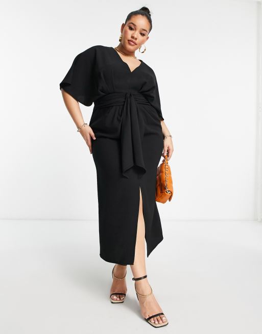 ASOS DESIGN Curve batwing plunge neck tie front crepe midi dress in black Very well made.