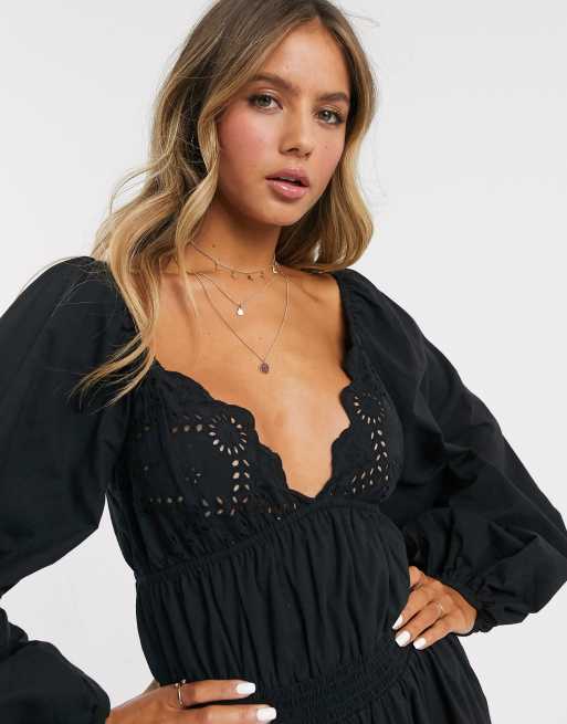 ASOS DESIGN sweetheart broderie mini dress with elasticated waist and long sleeves Very well made.
