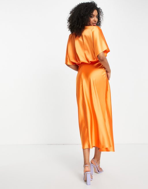 ASOS DESIGN wrap front batwing sleeve satin midi dress in orange Very well made.
