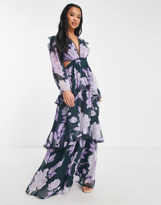 ASOS DESIGN Petite Robe longue manches longues et imprim fleuri avec finitions circulaires d tails ornement s Noir lilas Very well made.