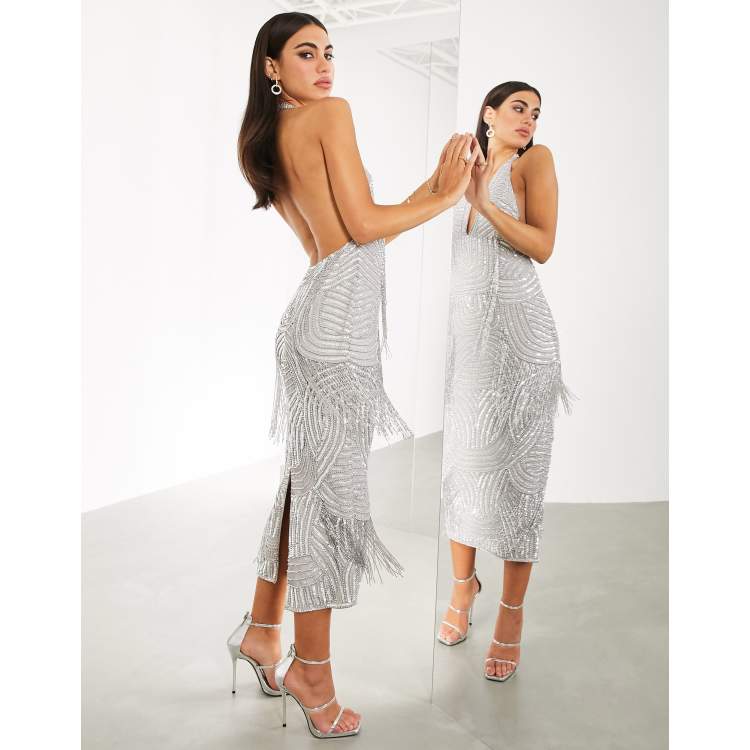 ASOS EDITION geo embellished fringe plunge midi dress in silver Very well made.