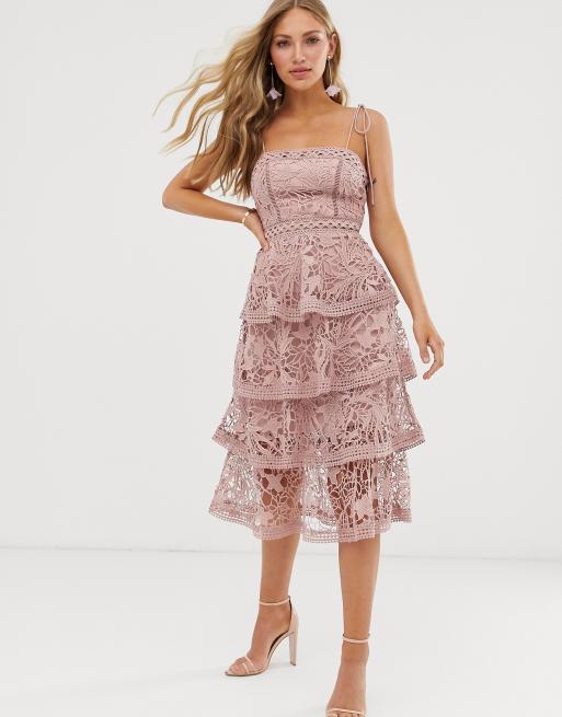 True Decadence premium square neck cami midi dress in all over lace with tiered skirt in soft pink Very well made.