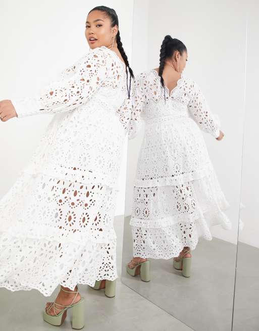 ASOS EDITION Curve v neck eyelet midi dress with puff sleeve in white Very well made.