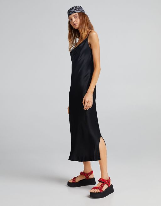 Bershka Robe longue bretelles fines en tissu sculptant doux au toucher Kaki Very well made.